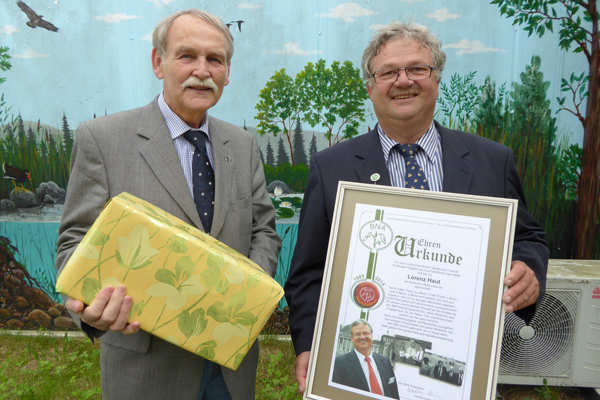 | BNA-Präsident Walter Grau (links) und BNA-Geschäftsführer Lorenz Haut mit Ehrenurkunde und Präsent. |
