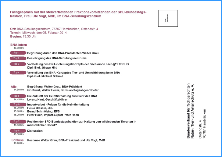 | Der Bundesverband für fachgerechten Natur-, Tier- und Artenschutz e.V. (BNA) wirbt seit Anbeginn mit dem Slogan "Biotope schützen, Natur bewahren, Arten erhalten". Das moderne BNA-Schulungszentrum in Hambrücken mit seinen vorbildlichen Tieranschauungsräumen ist einzigartig in Deutschland, ja in Europa. Nachdem vor kurzer Zeit CDU-Landtagsfraktionsvorsitzender Peter Hauk und CDU-Bundestagsabgeordneter Dr. Thomas Gebhard den BNA besuchten, stattete jetzt Ute Vogt, stellvertretende Fraktionsvorsitzende der SPD-Bundestagsfraktion, der Einrichtung einen Besuch ab. Nach Schwarz jetzt also Rot. |