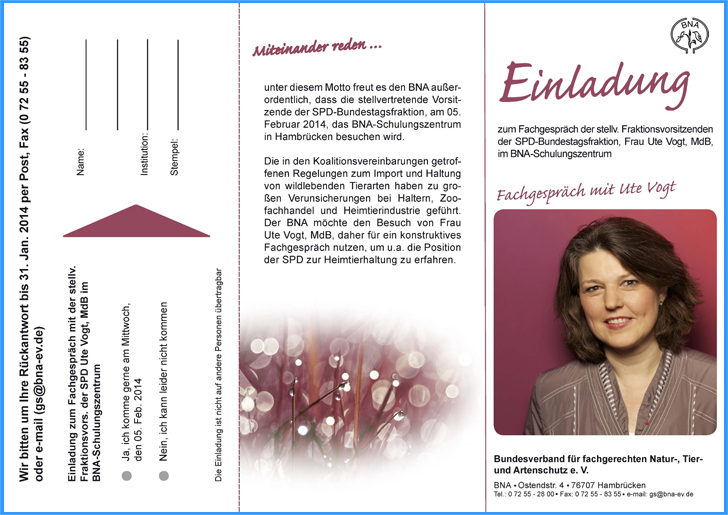 | Die in Heidelberg geborene und in Wiesloch aufgewachsene, 49-jährige, Politikerin nahm auf Einladung der BNA-Führungsspitze um Präsident Walter Grau an einem inhaltlich hochinteressanten Fachgespräch mit weiteren kompetenten Teilnehmern aus Tierschutz, Haltern, dem Zoofachhandel und der Heimtierindustrie, das unter dem Motto "Miteinander reden stand", teil. Die in Pforzheim lebende Ute Vogt steht nach der Rückkehr auf die politische Bühne immer mehr im Fokus der Medienöffentlichkeit. Der aus Köln angereiste BNA-Präsident eingangs: "Wir möchten jetzt und zukünftig einen fruchtbaren Dialog eingehen, Meinungen und Informationen austauschen". Die im Koalitionsvertrag stehende SPD-Forderung nach einem generellen, nationalen Importverbot für Wildtiere und dessen Folgen für die Heimtierhaltung hatte zuletzt nicht nur beim BNA für Irritation gesorgt. "Wir sind am Anfang eines Prozesses, wobei ich der Meinung bin, dass man exotische Tierhaltung nicht verbieten, sondern in entsprechende Bahnen lenken sollte", sagte die in Berlin für Umwelt, Naturschutz, Landwirtschaft und Ernährung zuständige, studierte Juristin und Verwaltungswissenschaftlerin. |