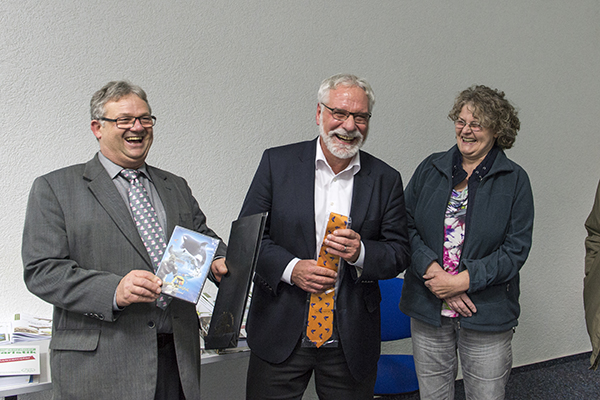 BNA-Geschäftsführer Lorenz Haut überreichte dem FDP-Landtagskandidaten neben einem guten Roten auch eine Krawatte mit Vogelmotiven sowie eine CD vom schönsten Zoo der Welt, dem Loro Parque auf Teneriffa